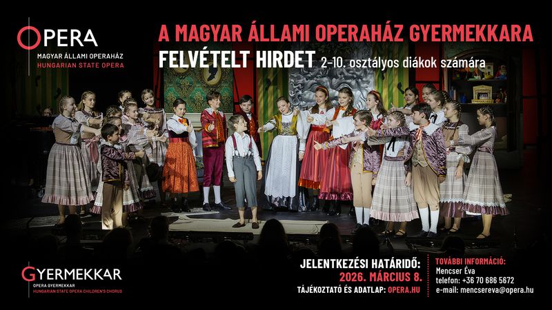 Szeretettel várjuk azoknak a magyarul folyékonyan beszélő, leendő 2–10. osztályos gyermekeknek a jelentkezését, akik szeretnének a Magyar Állami Operaház Gyermekkarában énekelni: jó hallással, tiszta énekhanggal rendelkeznek.